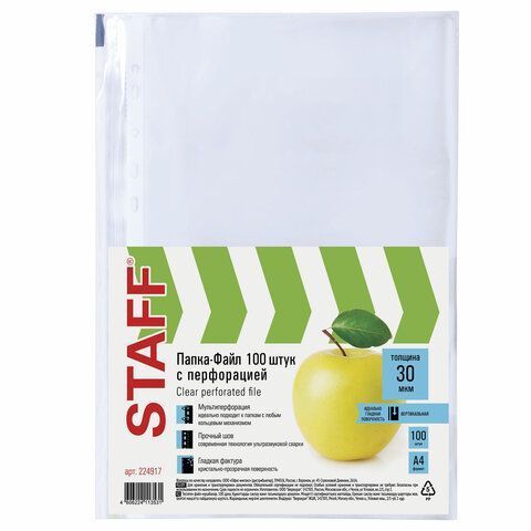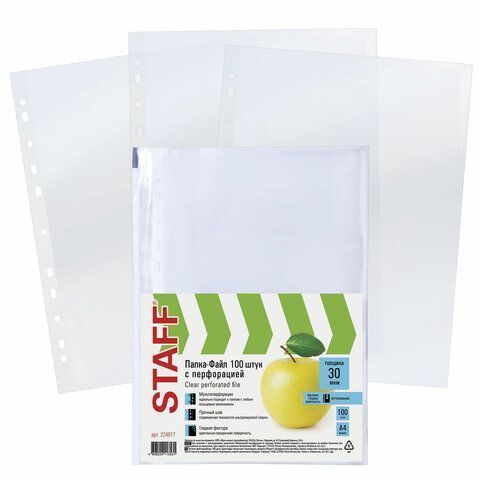 Перфофайлы А4 30 мкм гладкие STAFF 100шт яблоко 1/30 купить оптом и в розницу в Набережных Челнах