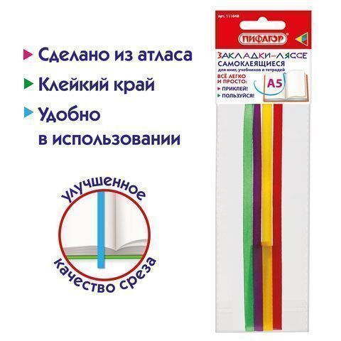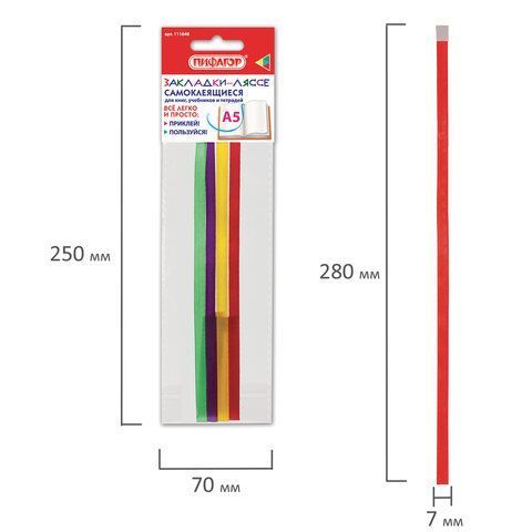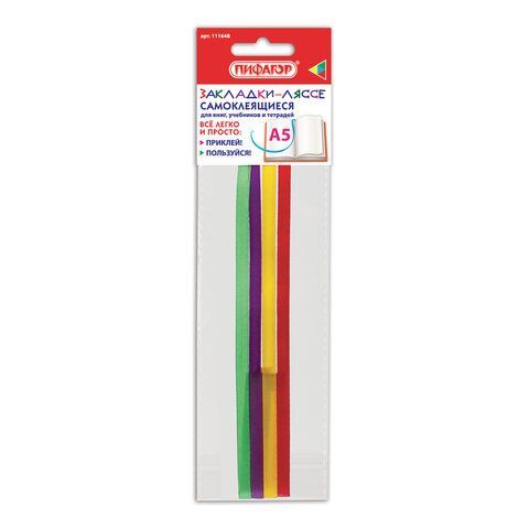 Закладки-ляссе РАДУГА для книг А5 (длина 28 см) ПИФАГОР, клейкий край, 4 ленты, 111648