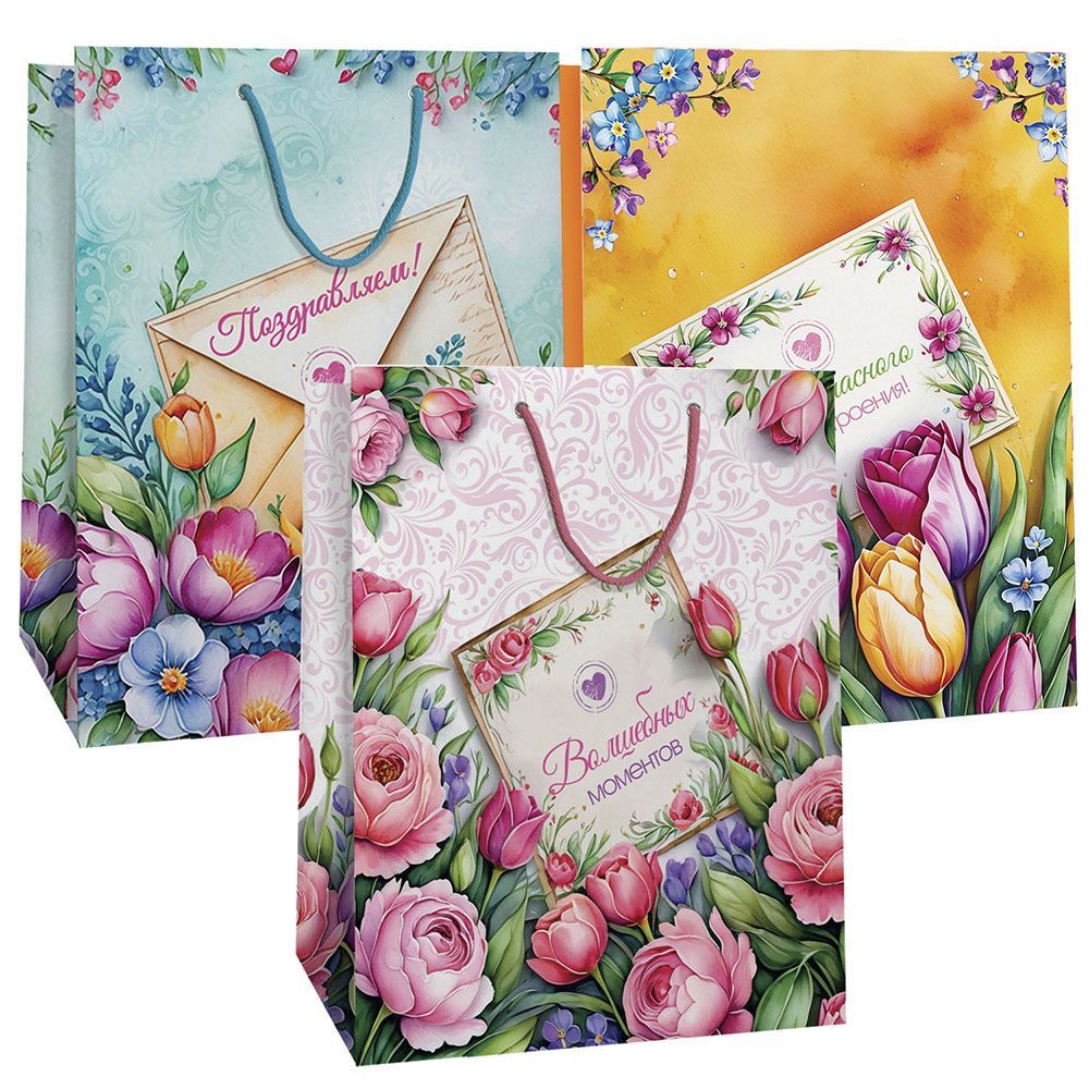 Пакет подарочный бумажный (18х23х10) ламинир Микс 3 дизайна 1/12/360 оптом и в розницу в Набережных Челнах, цены в каталоге с доставкой